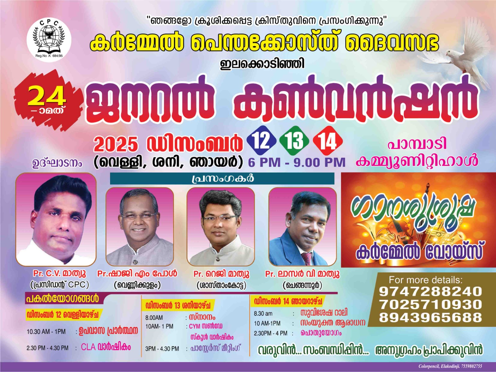 എന്നീ ദൈവദാസൻമാർ ദൈവവചനം ശുശ്രൂഷിക്കും . കർമ്മേൽ വോയ്സ് ഗാനശുശ്രൂഷക്ക് നേതൃത്വം നൽകുന്ന.