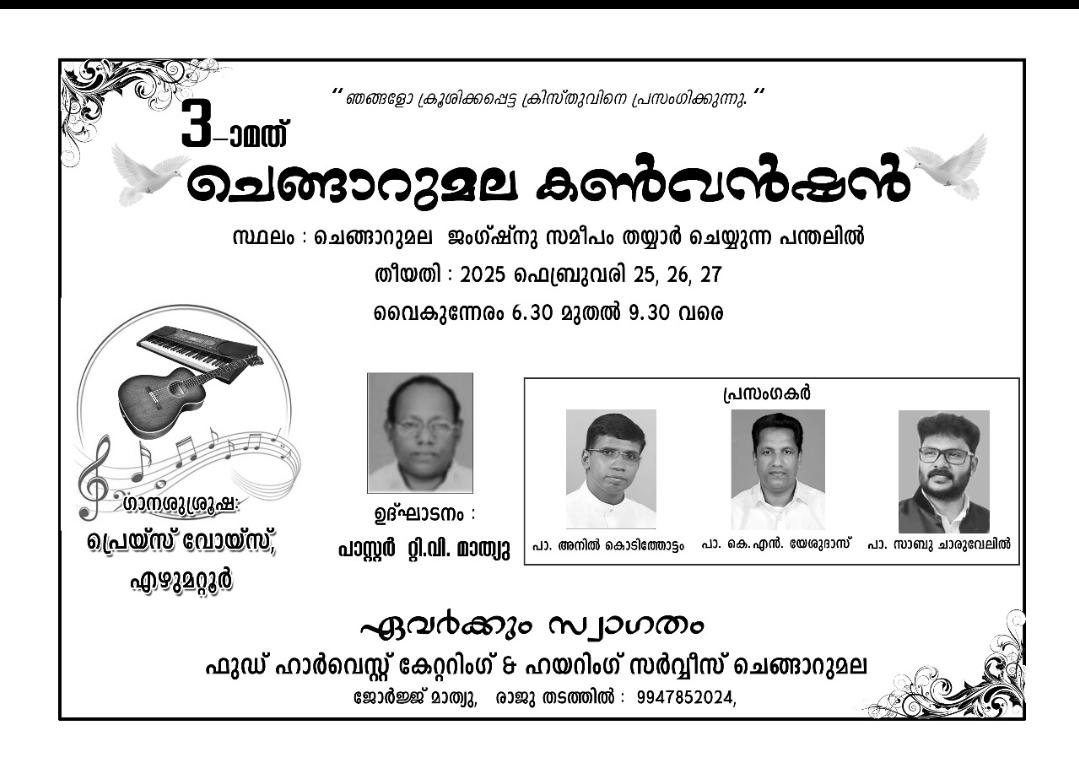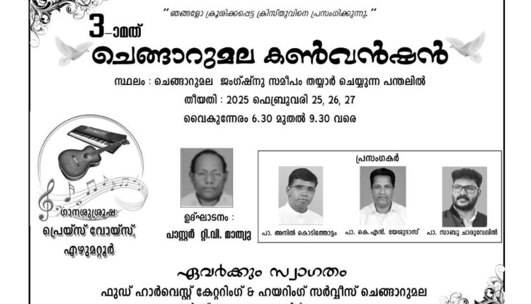 എഴുമറ്റൂർ: മൂന്നാമത് ചെങ്ങാറുമല കൺവൻഷൻ ഫെബ്രുവരി 25,26, 27 തീയതികളിൽ ചെങ്ങാറുമല ജംഗ്ഷനിൽ നടക്കും.