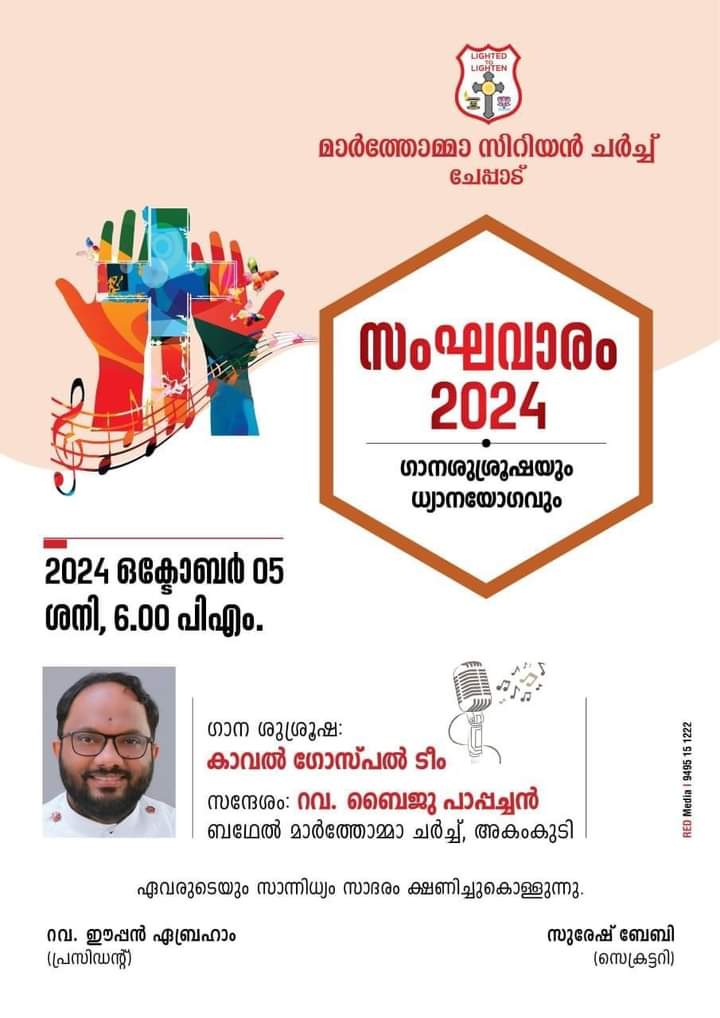 ചേപ്പാട് : ചേപ്പാട് മാർത്തോമ്മാ സിറിയൻ ചർച്ചിന്റെ ആഭിമുഖ്യത്തിൽ ശനിയാഴ്ച ചേപ്പാട് ചർച്ചിൽ സംഘവാരം 2024 ഗാനശുശ്രൂഷയും ധ്യാനയോഗവും നടക്കും. റവ. ബൈജു പാപ്പച്ചൻ പ്രസംഗിക്കും. കാവൽ ഗോസ്പൽ ടീം ഗാന ശുശ്രുഷ നയിക്കും. റവ. ഈപ്പൻ ഏബ്രഹാം, സുരേഷ് ബേബി എന്നിവർ നേതൃത്വം നൽകും.