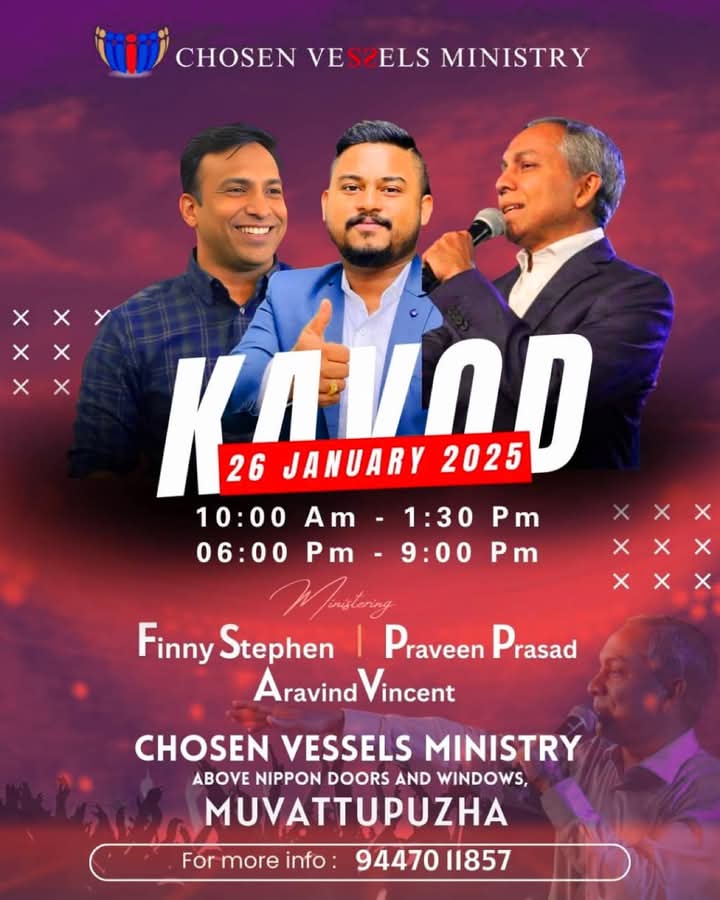 മുവാറ്റുപുഴയിൽ ചോസെൻ വെസ്സൽസ് മിനിസ്ട്രി ഉണർവ് യോഗം ChristianNews On Jan 12, 2025 1,452 മുവാറ്റുപുഴ : ചോസെൻ വെസ്സൽസ് മിനിസ്ട്രിയുടെ ആഭിമുഖ്യത്തിൽ ജനുവരി 26 ന് മുവാറ്റുപുഴയിൽ ഉണർവ് യോഗം നടക്കും. പാ. ഫിന്നി സ്റ്റീഫൻ, പാ. പ്രവീൺ പ്രസാദ്, അരവിന്ദ് വിൻസെന്റ് എന്നിവർ പ്രസംഗിക്കും. 1,452 Share