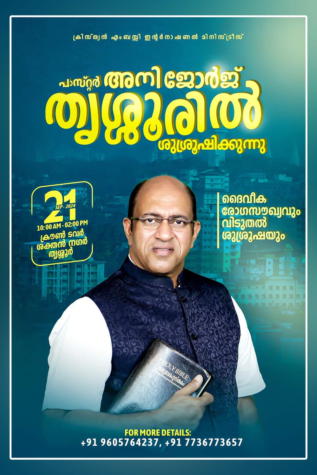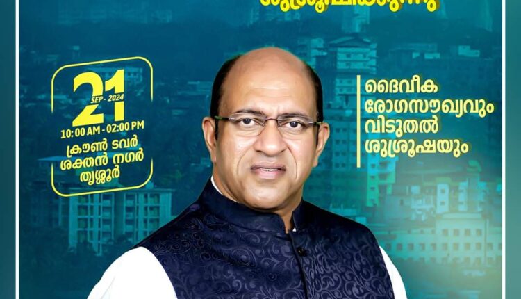 തൃശ്ശൂരിൽ ക്രിസ്ത്യൻ എംബസ്സി ഇന്റർനാഷണൽ മിനിസ്ട്രി ഡെലിവെറൻസ് മീറ്റിംഗ് ChristianNews On Sep 12, 2024 132 തൃശ്ശൂർ : ക്രിസ്ത്യൻ എംബസ്സി ഇന്റർനാഷണൽ മിനിസ്ട്രീസിന്റെ ആഭിമുഖ്യത്തിൽ സെപ്റ്റംബർ 21 ന് തൃശ്ശൂർ ശക്തൻ നഗർ ക്രൗൺ ടവറിൽ ഡെലിവെറൻസ് മീറ്റിംഗ് നടക്കും. പാ. അനി ജോർജ് പ്രസംഗിക്കും. 132 Share