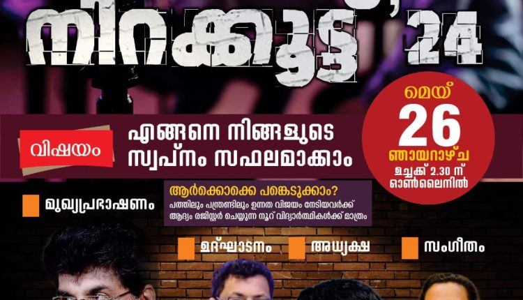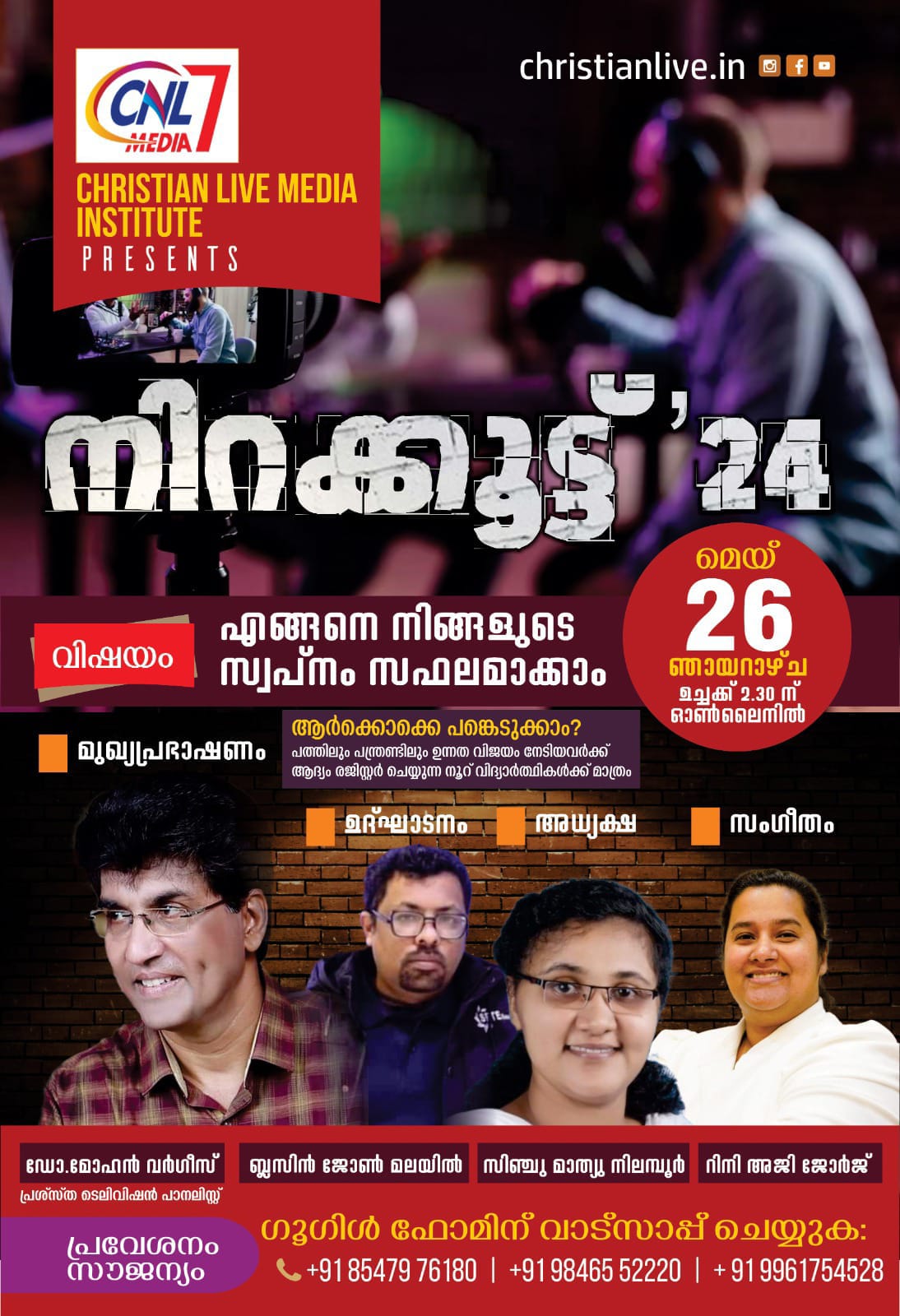 തിരുവല്ല: ക്രിസ്ത്യൻ ലൈവ് മീഡിയയുടെ ആഭിമുഖ്യത്തിൽ മെയ് 26 ഞായറാഴ്ച ഉച്ചകഴിഞ്ഞ് 2.30 ന് ഓൺലൈനിൽ വിദ്യാർത്ഥികൾക്കായി നിറക്കൂട്ട് പ്രോഗ്രാം നടക്കുന്നു. അധ്യാപകനും പ്രമുഖ ടെലിവിഷൻ പാനലിസ്റ്റുമായ ഡോ. മോഹൻ വർഗിസ് ക്ലാസുകൾ നയിക്കും. ജീവിതത്തിലെ സ്വപ്നങ്ങൾ എങ്ങനെ സഫലമാക്കാം എന്നതാണ് വിഷയം.