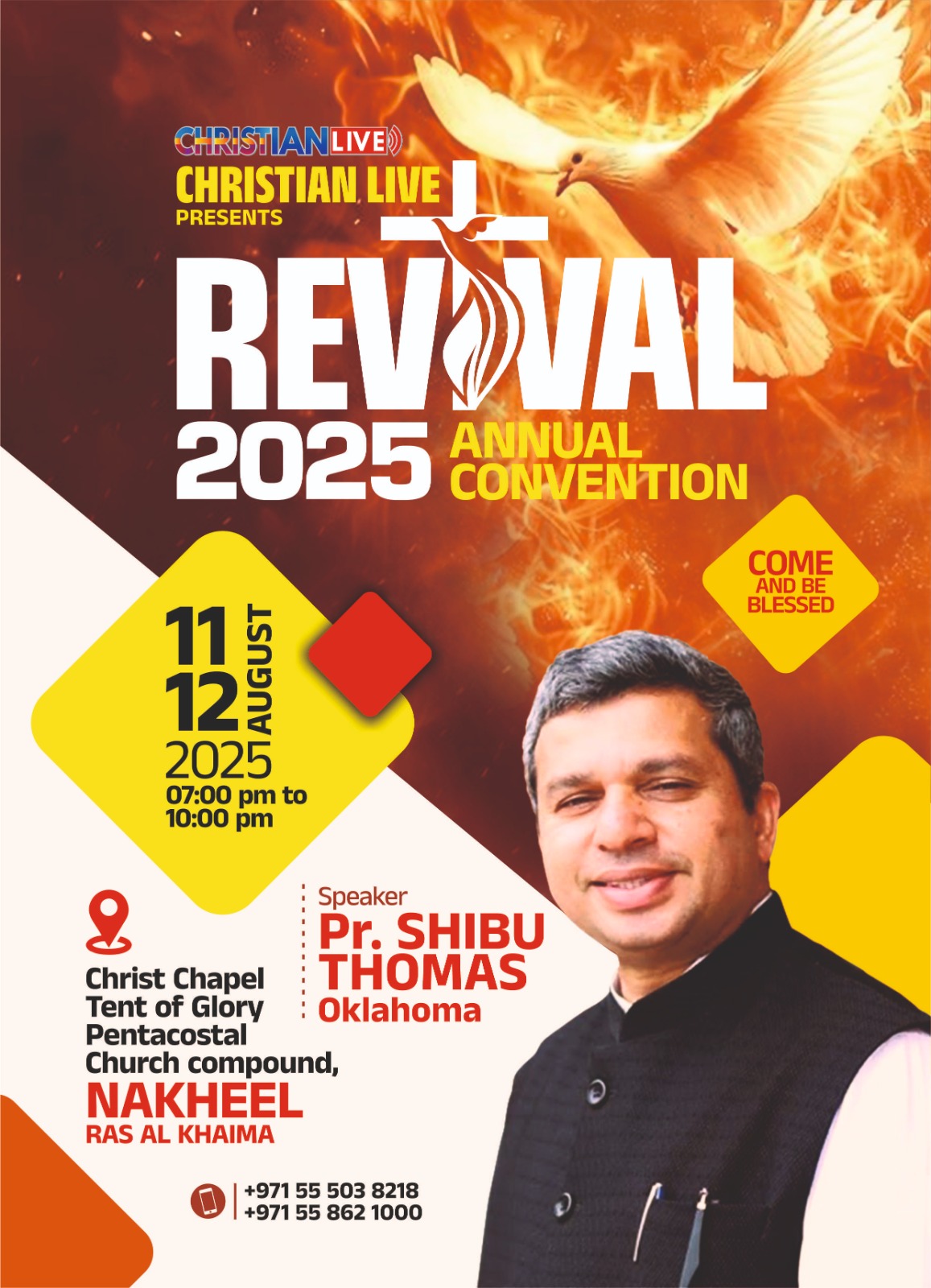 യുഎഇ : ക്രിസ്ത്യൻ ലൈവ് മീഡിയ മിനിസ്ട്രീസിന്റെ ആഭിമുഖ്യത്തിൽ ആഗസ്റ്റ് 11 നും 12 നുമായി വൈകുന്നേരം 7 മുതൽ 10 വരെ റാസൽ ഖൈമ നഖീൽ ക്രൈസ്റ്റ് ചാപ്പൽ ടെന്റ് ഓഫ് ഗ്ലോറി പെന്തക്കോസ്തൽ ചർച്ച് കോമ്പൗണ്ടിൽ റിവൈവൽ ആനുവൽ കൺവെൻഷൻ നടക്കും. പാ. ഷിബു തോമസ് പ്രസംഗിക്കും.
