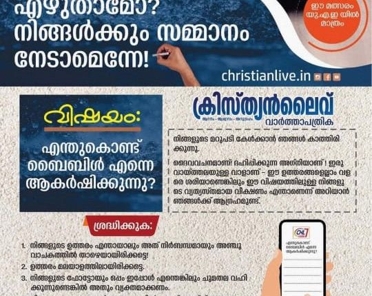 ക്രിസ്ത്യൻ ലൈവ് മിഡിൽ ഈസ്റ്റ് എഡിഷന്റെ ആഭിമുഖ്യത്തിൽ യുഎഇ യിൽ നടക്കുന്ന എഴുത്തുമത്സരത്തിലാണ് നിങ്ങൾക്ക് അവസരം ഒരുങ്ങുന്നത്.