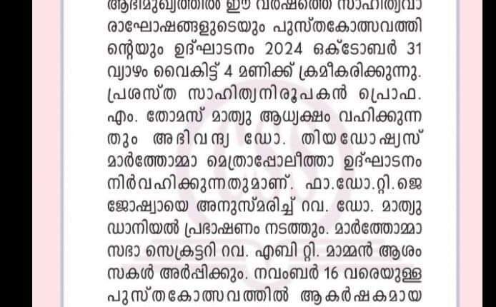 തിരുവല്ല : ക്രൈസ്തവ സാഹിത്യ സമിതിയുടെ ആഭിമുഖ്യത്തിൽ ഒക്ടോബർ 31 ന് ഈ വർഷത്തെ സാഹിത്യ വാരാഘോഷങ്ങളുടെയും പുസ്തകോത്സവത്തിന്റെയും ഉദ്ഘാടനം നടക്കും.