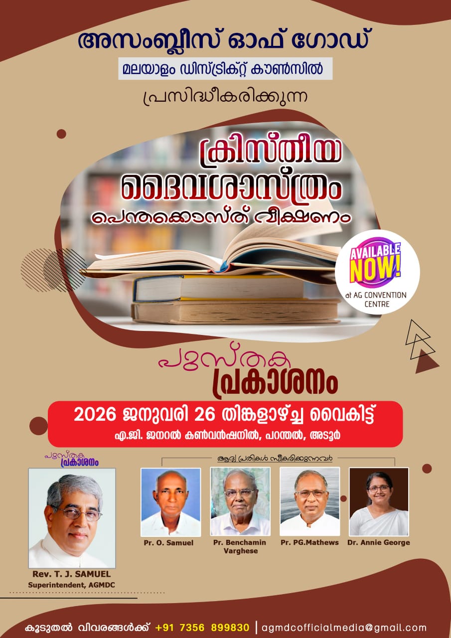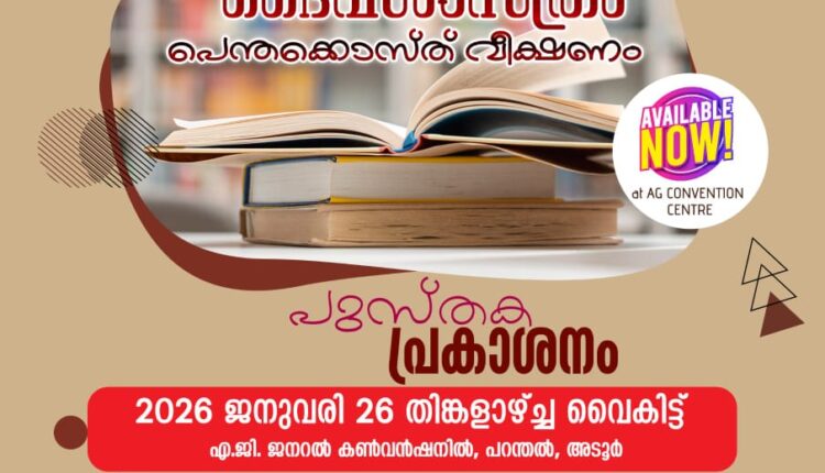 അസംബ്ലീസ് ഓഫ് ഗോഡ് മലയാളം ഡിസ്ട്രിക്ട് കൗൺസിൽ പ്രസിദ്ധീകരിക്കുന്ന ക്രിസ്തീയ ദൈവശാസ്ത്രം പെന്തക്കോസ്ത് വീക്ഷണം എന്ന ഗ്രന്ഥം ജനുവരി 26 തിങ്കൾ വൈകിട്ട് ഏഴിന് എ.ജി ജനറൽ കൺവൻഷനോട് അനുബന്ധിച്ച് പറന്തലിൽ നടക്കും. സഭയുടെ സൂപ്രണ്ടും പുസ്തകത്തിൻ്റെ എഡിറ്ററുമായ പാസ്റ്റർ ടി.ജെ. സാമുവേൽ പാസ്റ്റർ ബഞ്ചമിൻ വർഗീസ്, പാസ്റ്റർ പി.ജി.മാത്യൂസ്, ഡോ.ആനി ജോർജ്, പാസ്റ്റർ ഒ.സാമുവേൽ എന്നിവർക്ക് ആദ്യ പ്രതികൾ നല്കി പ്രകാശനം നിർവ്വഹിക്കും. ഡിസ്ട്രിക്ട് കൗൺസിൽ അസിസ്റ്റൻറ് സൂപ്രണ്ട് ഡോ.ഐസക് വി മാത്യു സെക്രട്ടറി പാസ്റ്റർ തോമസ് ഫിലിപ്പ് കമ്മിറ്റിയംഗം പാസ്റ്റർ ബാബു വർഗീസ് എന്നിവർ സംബന്ധിക്കും.പ്രൊഡക്ഷൻ എക്സിക്യൂട്ടീവ് ഷാജൻ ജോൺ ഇടയ്ക്കാട് ക്രമീകരണങ്ങൾക്ക് നേതൃത്വം നല്കും.