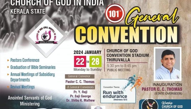മുളക്കുഴ: ചര്ച്ച് ഓഫ് ഗോഡ് കേരളാ സ്റ്റേറ്റ്101-ാമത് ജനറല് കണ്വന്ഷന് 2024 ജനുവരി 22 മുതല് 28 വരെ തിരുവല്ലയിലുള്ള ചര്ച്ച് ഓഫ് ഗോഡ് സ്റ്റേഡിയത്തില് നടക്കും. സ്വദേശത്തും വിദേശത്തുമുള്ള ആയിരക്കണക്കിന് വിശ്വാസികളും ശുശ്രൂഷകന്മാരും കണ്വന്ഷനില് സംബന്ധിക്കും. സ്ഥിരതയോടെ ഓടുക എന്നതാണ് ഈ വർഷത്തെ കൺവെൻഷൻ ചിന്ത വിഷയം.