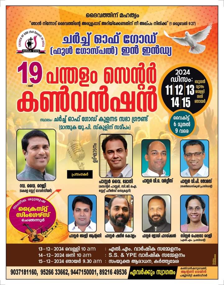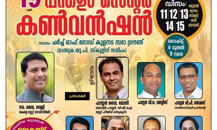 കുളനട : ചർച്ച് ഓഫ് ഗോഡ് (ഫുൾ ഗോസ്പൽ) ഇൻ ഇന്ത്യ പന്തളം സെന്ററിന്റെ ആഭിമുഖ്യത്തിൽ ഡിസംബർ 11 മുതൽ 15 വരെ ചർച്ച് ഓഫ് ഗോഡ് കുളനട സഭാ ഗ്രൗണ്ടിൽ 19 -മത് സെന്റർ കൺവൻഷൻ നടക്കും.