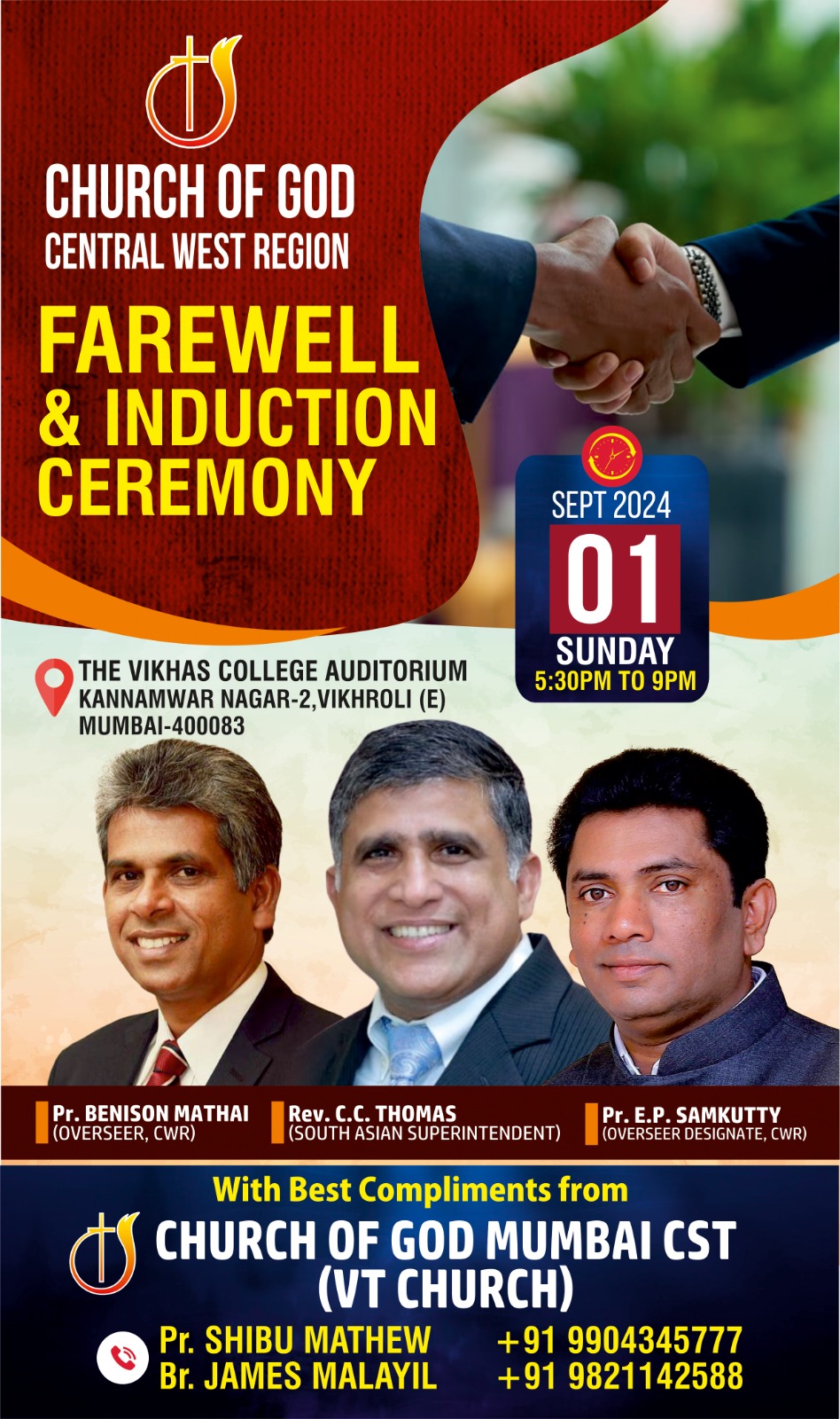 മുംബൈ : ചർച്ച് ഓഫ് ഗോഡ് സെൻട്രൽ വെസ്റ്റ് റീജിയന്റെ ആഭിമുഖ്യത്തിൽ സെപ്റ്റംബർ 1 ന് മുംബൈ കണ്ണംവാർ വിഖാസ് കോളേജ് ഓഡിറ്റോറിയത്തിൽ ഫേർവൽ ആൻഡ് ഇൻഡക്ഷൻ സെർമണി നടക്കും. പാ. ഇ. പി. സാംകുട്ടി, പാ. ബെനിസൺ മത്തായി, റവ. സി.സി. തോമസ് എന്നിവർ പ്രസംഗിക്കും.