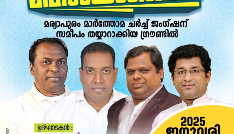 മര്യാപുരം : ചർച്ച് ഓഫ് ഗോഡ് ഡെലിവറൻസ് മിനിസ്ട്രീസിന്റെ ആഭിമുഖ്യത്തിൽ തിങ്കളാഴ്ച മുതൽ ബുധനാഴ്ച വരെ മര്യാപുരം മാർത്തോമ ചർച്ച് ജംഗ്ഷന് സമീപം തയ്യാറാക്കിയ ഗ്രൗണ്ടിൽ സുവിശേഷ മഹായോഗങ്ങൾ നടക്കും.