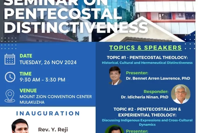 മുളക്കുഴ : ചർച്ച് ഓഫ് ഗോഡ് എജ്യുക്കേഷൻ ഡിപ്പാർട്ട്മെന്റിന്റെ ആഭിമുഖ്യത്തിൽ നവംബർ 26 ന് മുളക്കുഴ മൗണ്ട് സീയോൻ കൺവൻഷൻ സെൻ്ററിൽ പെന്തക്കോസ്ത് ദൈവശാസ്ത്ര സെമിനാർ നടക്കും.