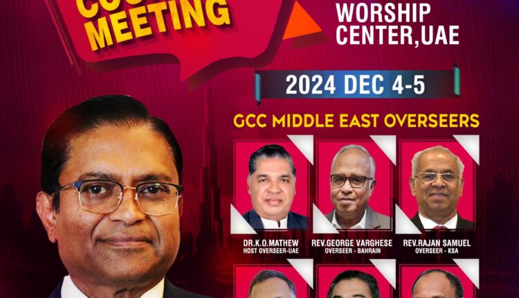 യുഎഇ : ചർച് ഓഫ് ഗോഡ് സഭകളുടെ ജിസിസി മിഡിൽ ഈസ്റ്റ് റീജിയണിലുള്ള ലീഡർഷിപ് കൗൺസിൽ ഡിസംബർ 4,5 തിയതികളിൽ ഷാർജയിലെ വർഷിപ് സെന്ററിൽ നടക്കും.