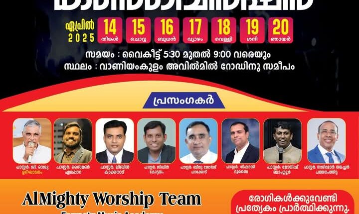 പാ. ജി രാജു ഉദ്‌ഘാടനം നിർവഹിക്കും. പാസ്റ്റർമാരായ സൈമൺ ഏലപ്പാറ, ലിബിൻ കാക്കനാട്, ജിബിൻ കോട്ടയം, ബിനു ജോർജ്, നിഷാന്ത് ദുബായ്, മോനിഷ് ബാംഗ്ലൂർ, സജിമോൻ തങ്കച്ചൻ എന്നിവർ പ്രസംഗിക്കും. ഓൾമൈറ്റി വർഷിപ് ടീം ഗാന ശുശ്രൂഷ നിർവഹിക്കും.