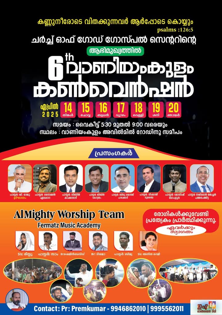 വാണിയംകുളം : ചർച്ച് ഓഫ് ഗോഡ് ഗോസ്‌പൽ സെന്ററിന്റെ ആഭിമുഖ്യത്തിൽ ഏപ്രിൽ 14 മുതൽ 20 വരെ വാണിയംകുളം അവിൽമിൽ റോഡിനു സമീപം 6 -മത് വാണിയംകുളം കൺവെൻഷൻ നടക്കും.