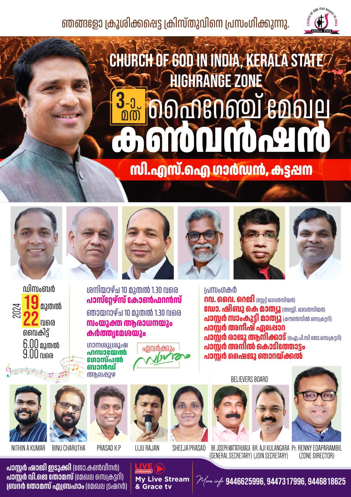 കട്ടപ്പന: ചർച്ച്ഓഫ് ഗോഡ് ഇൻ ഇന്ത്യാ ഹൈറേഞ്ച് മേഖല കൺവൻഷൻ ഡിസം. 19 മുതൽ 22 വരെ കട്ടപ്പന സി.എസ്.ഐ ഗാർഡനിൽ നടക്കും