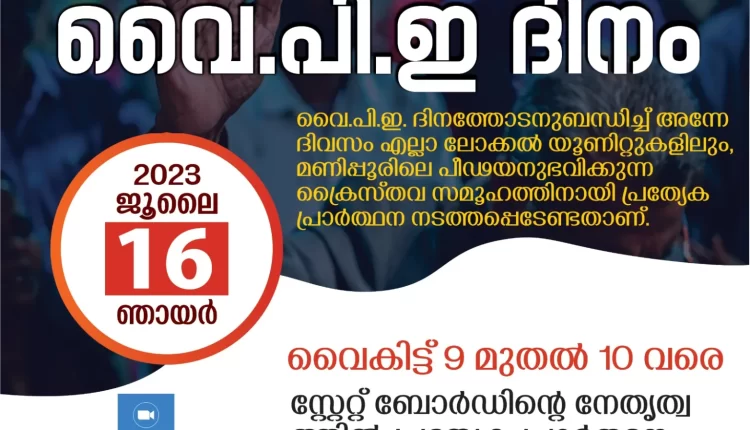 തിരുവല്ല : ചർച്ച് ഓഫ് ഗോഡ് ഇൻ ഇന്ത്യ YPE കേരള സ്റ്റേറ്റ്, YPE ദിനമായി ജൂലൈ 16 ന് ലോക്കൽ യൂണിറ്റുകളിലും മണിപ്പൂരിലെ പീഢിത ജനതയ്ക്ക് വേണ്ടി പ്രാർത്ഥന നടത്തും. ഓൺലൈനായി വൈകിട്ട് 9 – 10 വരെ യാണ് പ്രാർത്ഥന ക്രമീകരിച്ചിരിക്കുന്നത്. ZOOM ID : 898 4595 1077 passcode : MANIPUR