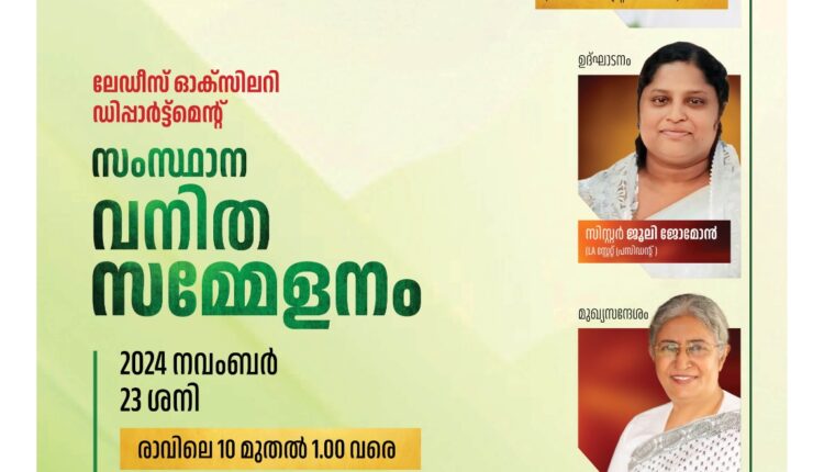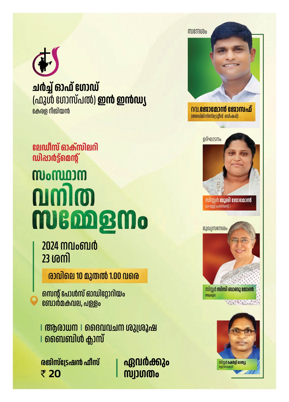 പള്ളം : ചർച്ച് ഓഫ് ഗോഡ് (ഫുൾ ഗോസ്പൽ) ഇൻ ഇന്ത്യ കേരള റീജിയൻ ലേഡീസ് ഓക്സിലറി ഡിപ്പാർട്ട്മെന്റിന്റെ ആഭിമുഖ്യത്തിൽ നാളെ പള്ളം ബോർമകവല സെന്റ് പോൾസ് ഓഡിറ്റോറിയത്തിൽ സംസ്ഥാന വനിത സമ്മേളനം നടക്കും.
