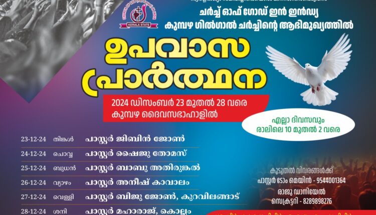 കുമ്പഴ : ചർച്ച് ഓഫ് ഗോഡ് ഇൻ ഇന്ത്യ കുമ്പഴ ഗിൽഗാൽ ചർച്ചിൻ്റെ ആഭിമുഖ്യത്തിൽ ഡിസംബർ 23 മുതൽ 28 വരെ കുമ്പഴ ദൈവസഭാഹാളിൽ ഉപവാസ പ്രാർത്ഥന നടക്കും. വിവിധ ദിവസങ്ങളിലായി പാസ്റ്റർമാരായ ജിബിൻ ജോൺ, ഷൈജു തോമസ്, ബാബു അതിരുങ്കൽ, അനീഷ് കാവാലം, ബിജു ജോൺ, മഹാരാജ് കൊല്ലം എന്നിവർ പ്രസംഗിക്കും.