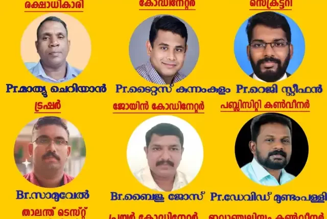 പുതിയ ഭാരവാഹിളായി പാ മാത്യു ചെറിയാൻ (രക്ഷാധികാരി), പാ ടൈറ്റസ്(കോഡിനേറ്റർ), പാ റെജി സ്റ്റീഫൻ(സെക്രട്ടറി), ബ്രദർ സാമുവേൽ(ട്രഷറർ), ബ്രദർ ബൈജു ജോസ്(ജോയിൻ കോഡിനേറ്റർ), പാ ഡേവിഡ് മുണ്ടംപള്ളി(പബ്ലിസിറ്റി കൺവീനർ), പാ റെജി ടി രാജു(താലന്ത് ടെസ്റ്റ് കൺവീനർ), പാ അനിൽ വർഗീസ്(ഇവാഞ്ചലിസം കൺവീനർ), പാ കെ സി ജോസ് (പ്രയർ കോഡിനേറ്റർ) എന്നിവരെ തിരഞ്ഞെടുത്തു.