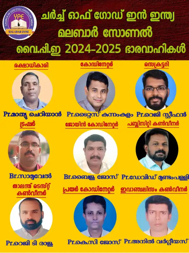 മുളക്കുഴ : ചർച്ച് ഓഫ് ഗോഡ് ഇൻ ഇന്ത്യ മലബാർ സോണലിന്റെ ആഭിമുഖ്യത്തിൽ ചർച്ച് ഓഫ് ഗോഡ് ചെറുതുരുത്തി സഭയിൽ നടന്ന ജനറൽബോഡിയിൽ മലബാർ സോണൽ വൈപിഇ 2024- 25 ഭാരവാഹികളെ തിരഞ്ഞെടുത്തു.
