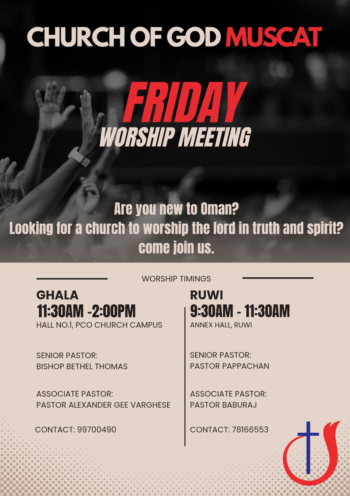 മസ്കറ്റ്: ഒമാനിലെ മലയാളി പെന്തെക്കോസ്ത് വിശ്വാസികൾക്കായി ചർച്ച് ഓഫ് ഗോഡ് മസ്കറ്റ് വിവിധ കേന്ദ്രങ്ങളിൽ വെള്ളിയാഴ്ച ആരാധനകൾ സംഘടിപ്പിക്കുന്നു. മസ്കറ്റിലെ പ്രധാന കേന്ദ്രങ്ങളായ ഗാല, റൂവി എന്നിവിടങ്ങളിലാണ് ആരാധനാ യോഗങ്ങൾ നടക്കുന്നത്.