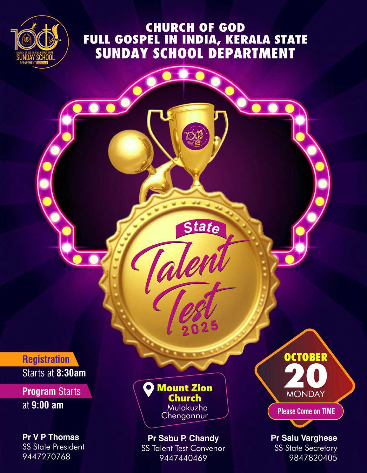 മുളക്കുഴ: ചർച്ച് ഓഫ് ഗോഡ് കേരളാ സ്റ്റേറ്റ് സൺഡേ സ്കൂൾ ഡിപ്പാർട്ട്മെന്റിന്റെ ആഭിമുഖ്യത്തിൽ നടക്കുന്ന സ്റ്റേറ്റ് താലന്ത് പരിശോധന, ഒക്ടോബർ 20 തിങ്കളാഴ്ച രാവിലെ 9 മുതൽ സഭാ ആസ്ഥാനമായ മുളക്കുഴയിൽ നടക്കും. കേരളത്തിലെ ഒൻപത് സോണണുകളിൽ നിന്നും വിജയികളായ 300 ൽ പരം കുട്ടികളാണ് മത്സരത്തിൽ പങ്കെടുക്കുന്നത്.