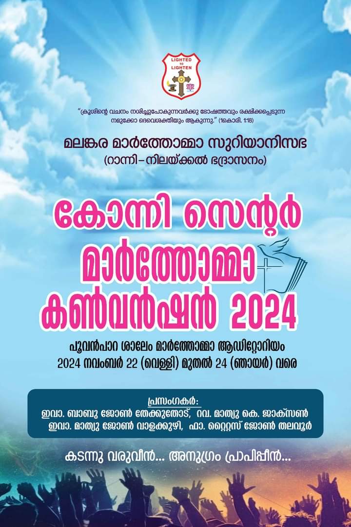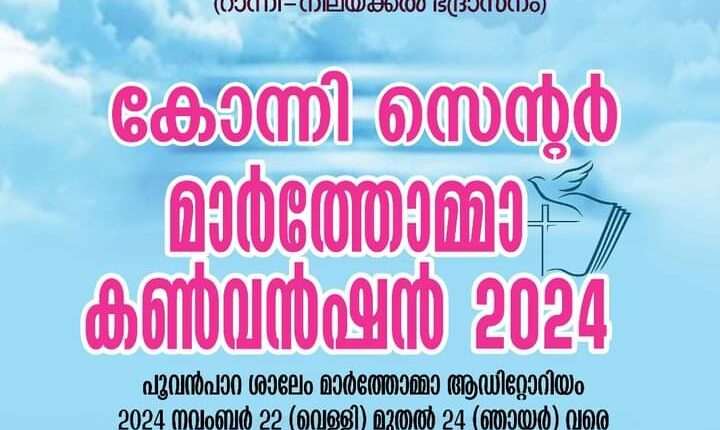 പൂവൻപാറ : മലങ്കര മാർത്തോമ്മാ സുറിയാനിസഭ റാന്നി- നിലയ്ക്കൽ ഭദ്രാസനത്തിന്റെ നേതൃത്വത്തിൽ നവംബർ 22 വെള്ളിയഴ്ച മുതൽ ഞായറാഴ്ച വരെ പൂവൻപാറ ശാലേം മാർത്തോമ്മാ ആഡിറ്റോറിയത്തിൽ കോന്നി സെൻ്റർ മാർത്തോമ്മാ കൺവൻഷൻ 2024 നടക്കും. ഇവാ. ബാബു ജോൺ തേക്കുതോട്, റവ. മാത്യു കെ. ജാക്സൺ, ഇവാ. മാത്യു ജോൺ വാളക്കുഴി, ഫാ. റ്റൈറ്റസ് ജോൺ തലവൂർ എന്നിവർ പ്രസംഗിക്കും.