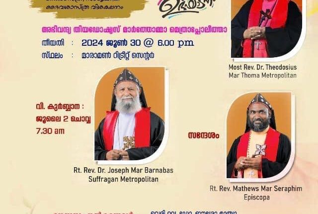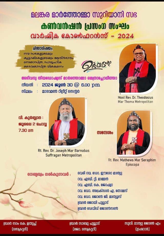 മാരാമൺ : മലങ്കര മാർത്തോമാ സുറിയാനി സഭയുടെ ആഭിമുഖ്യത്തിൽ ഞായറഴ്ച മാരാമൺ റിട്രീറ്റ് സെന്ററിൽ കൺവെൻഷൻ പ്രസംഗ സംഘം വാർഷിക കോൺഫ്രൻസ് നടക്കും. തിയഡോഷ്യസ് മാർത്തോമാ മെത്രോപ്പോലീത്ത ഉദ്ഘാടനം ചെയ്യും. റവ മാത്യൂസ് മാർ സെറാഫിം എപ്പിസ്കോപ്പ പ്രസംഗിക്കും.