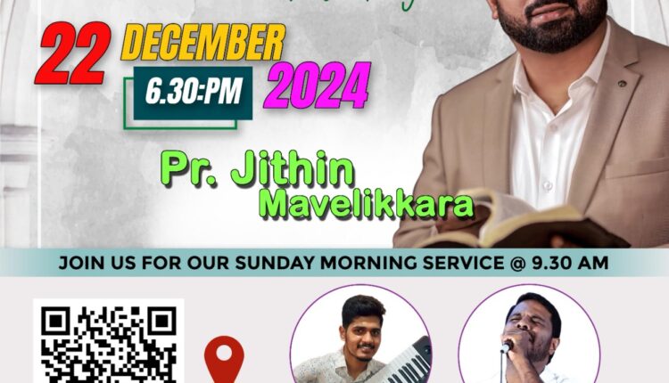 പാ. ജിതിൻ മാവേലിക്കര പ്രസംഗിക്കും. ഇവാ. ഷാജി ജോൺ, നൈഫിൻ പി ഷാജി എന്നിവർ ഗാന ശുശ്രൂഷ നയിക്കും.