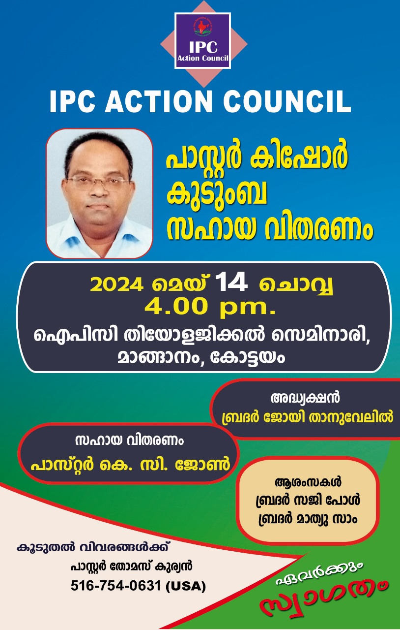 മാങ്ങാനം ഐപിസി തിയോളജിക്കൽ സെമിനാരിയിൽ നടക്കുന്ന സമ്മേളനത്തിൽ ബ്രദർ ജോയി താനുവേലിൽ അധ്യക്ഷത വഹിക്കും. ബ്രദർ സജി പോൾ, ബ്രദർ മാത്യു സാം എന്നിവർ പ്രസംഗിക്കും. പാ. തോമസ് കുര്യന്റെ നേതൃത്വത്തിലാണ് ആക്ഷൻ കൗൺസിൽ സഹായ വിതരണത്തിനുള്ള തുക കണ്ടെത്തിയത്.