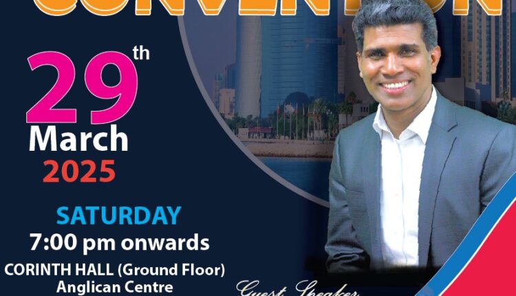 ദോഹ – ഖത്തർ ഷാരോൺ ഫെല്ലോഷിപ്പ് ചർച്ച് വൺ ഡേ കൺവെൻഷൻ ChristianNews On Mar 4, 2025 75 ഖത്തർ : ദോഹ – ഖത്തർ ഷാരോൺ ഫെല്ലോഷിപ്പ് ചർച്ചിന്റെ ആഭിമുഖ്യത്തിൽ മാർച്ച് 29 ന് ആംഗ്ലിക്കൻ സെന്റർ കൊരിന്ത് ഹാളിൽ വൺ ഡേ കൺവെൻഷൻ നടക്കും. പാ. സന്തോഷ് തര്യൻ പ്രസംഗിക്കും. ഖത്തർ ഷാരോൺ ഫെലോഷിപ്പ് ചർച്ച് കൊയർ ഗാന ശുശ്രൂഷ നിർവഹിക്കും. 75 Share