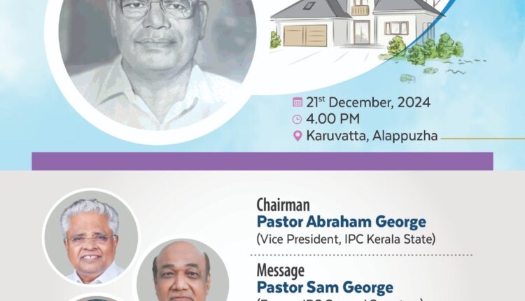 ആലപ്പുഴ: ഐ.പി.സി ശതാബ്ദി വർഷത്തോടുള്ള ബന്ധത്തിൽ തുടക്കം കുറിച്ച പാസ്റ്റർ പി. പി തോമസ് മെമ്മോറിയൽ ബേത് ലഹേം ഹോംസിന്റെ നിർമ്മാണം പൂർത്തിയായ രണ്ട് കുടുംബങ്ങൾക്കുള്ള ഭവനത്തിന്റെ താക്കോൽ ദാനം ഇന്ന് വൈകിട്ട് നാലിന് നടത്തപ്പെടും