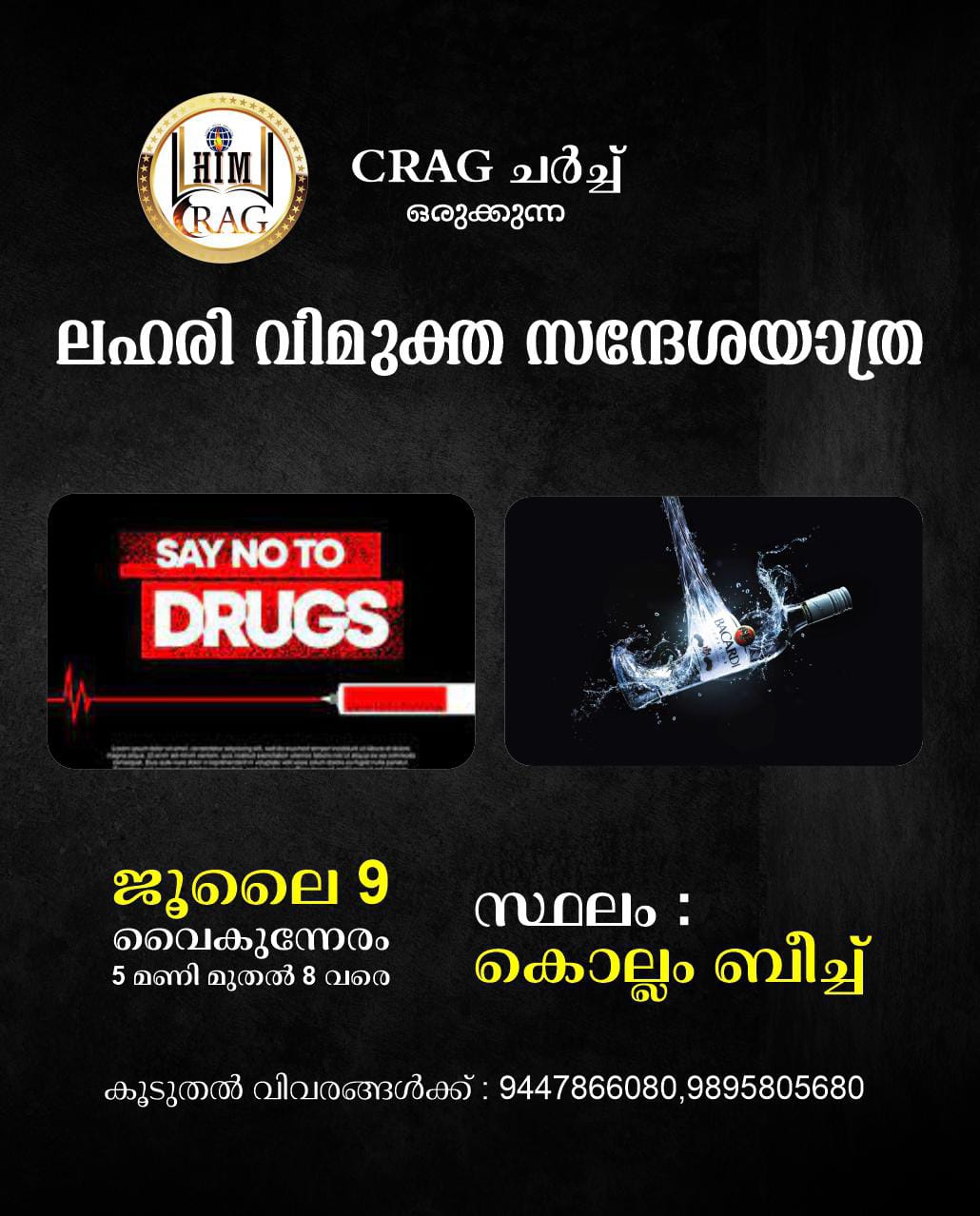 ലഹരി വിമുക്ത സന്ദേശ യാത്ര News On Jul 8, 2023 234 കൊല്ലം : സിറ്റി റിവൈവൽ അപ്പൊസ്തോലിക് ജനറേഷൻ ചർച്ചിന്റെ നേതൃത്വത്തിൽ ലഹരി വിമുക്ത സന്ദേശ യാത്ര ജൂലൈ 9 ഞായറഴ്ച് വൈകുന്നേരം 5 മണി മുതൽ 8 മണി വരെ കൊല്ലം ബീച്ചിൽ നടക്കും. കൂടുതൽ വിവരങ്ങൾക്ക് 9447866080, 9895805680 234 Share