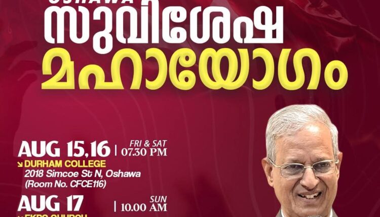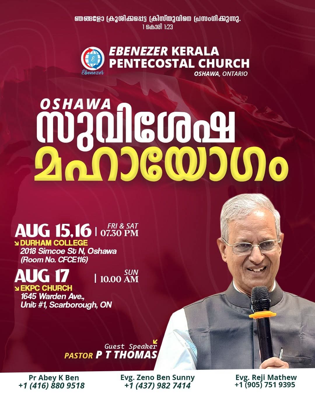 ഓഷവ : എബനേസർ കേരള പെന്തക്കോസ്റ്റൽ ചർച്ച് ഓഷവ കാനഡയുടെ പ്രഥമ വാർഷിക കൺവൻഷൻ ആഗസ്റ്റ് 15 മുതൽ 16 വരെ ദുർഹം കോളേജിൽ നടക്കും. പാ. പി റ്റി തോമസ് പ്രസംഗിക്കും.