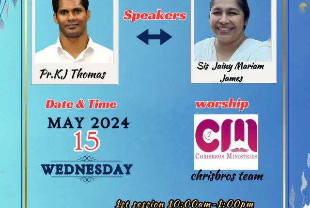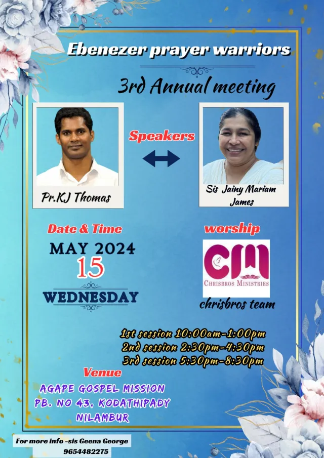 പാലക്കാട് : എബനേശർ പ്രെയർ വാരിയേഴ്സിൻ്റെ ആഭിമുഖ്യത്തിൽ മൂന്നാമത് വാർഷികയോഗം 15 ന് ബുധനാഴ്ച നിലമ്പൂർ കൊടത്തിപ്പടി അഗപ്പെ ഗോസ്പൽ മിഷൻ ആഡിറ്റോറിയത്തിൽ വച്ച് നടക്കും. രാവിലെ 10 മുതൽ 1 മണിവരെയും ഉച്ചക്ക് 2-30 മുതൽ 4.30 വരെയും വൈകിട്ട് 5.30 മുതൽ 8-30 വരെയും മാണ് യോഗങ്ങൾ നടക്കുന്നത്. പാസ്റ്റർ കെ.ജെ തോമസ് കുമളി,സിസ്റ്റർ ജെയ്നി മരിയം ജയിംസ് എന്നിവർ ദൈവവചനം ശുശ്രൂഷിക്കും. ക്രൈസ്റ്റ് ബ്രദേഴ്സ് മിനിസ്ട്രീ ഗാനശുശ്രൂഷ നടത്തും. സിസ്റ്റർ ജീനാ ജോർജ്ജ് യോഗങ്ങൾക്ക് നേതൃത്വം നൽകും.