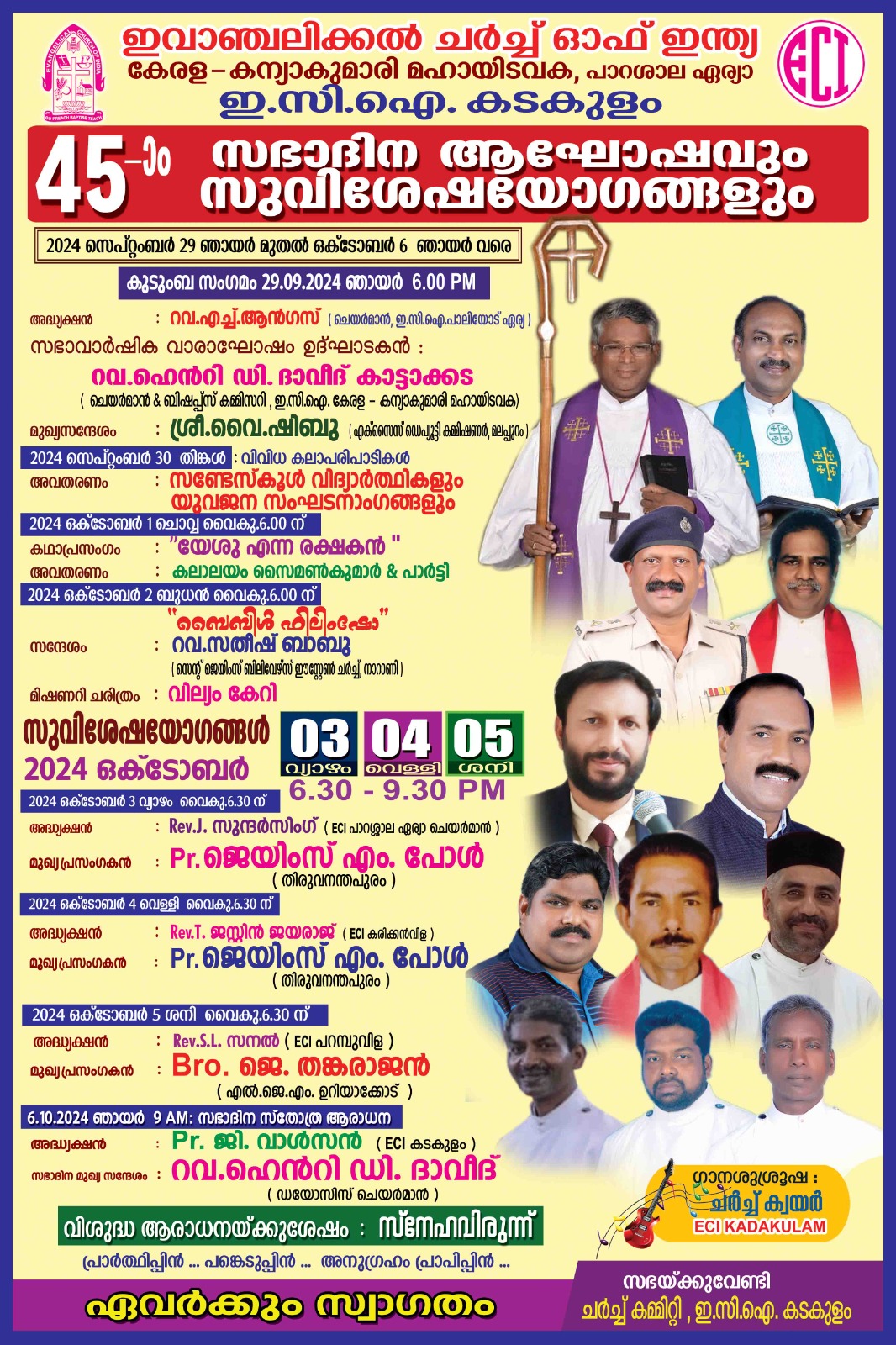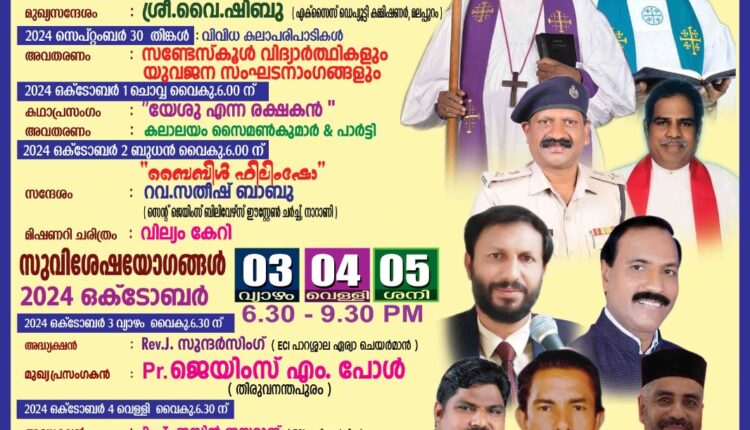 ഒക്ടോബർ 3 മുതൽ 5 വരെ സുവിശേഷയോഗങ്ങൾ നടക്കും. വിവിധ ദിവസങ്ങളിൽ റവ .ജെ. സുന്ദർസിംഗ്, റവ.ടി. ജസ്റ്റിൻ ജയരാജ്, റവ.എസ്.എൽ. സനൽ, പാ. ജി. വാൾസൻ എന്നിവർ അധ്യക്ഷത വഹിക്കും. പാ. ജെയിംസ് എം. പോൾ, ബ്രദർ ജെ. തങ്കരാജൻ, റവ. ഹെൻറി ഡി. ദാവീദ് എന്നിവർ പ്രസംഗിക്കും. ചർച്ച് കൊയർ ഗാന ശുശ്രുഷ നയിക്കും.