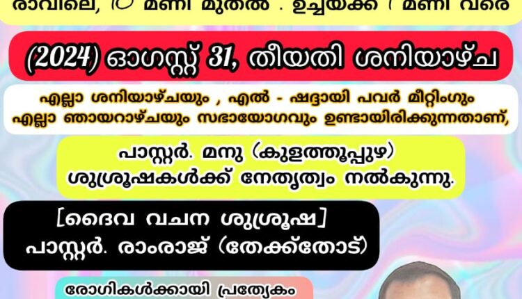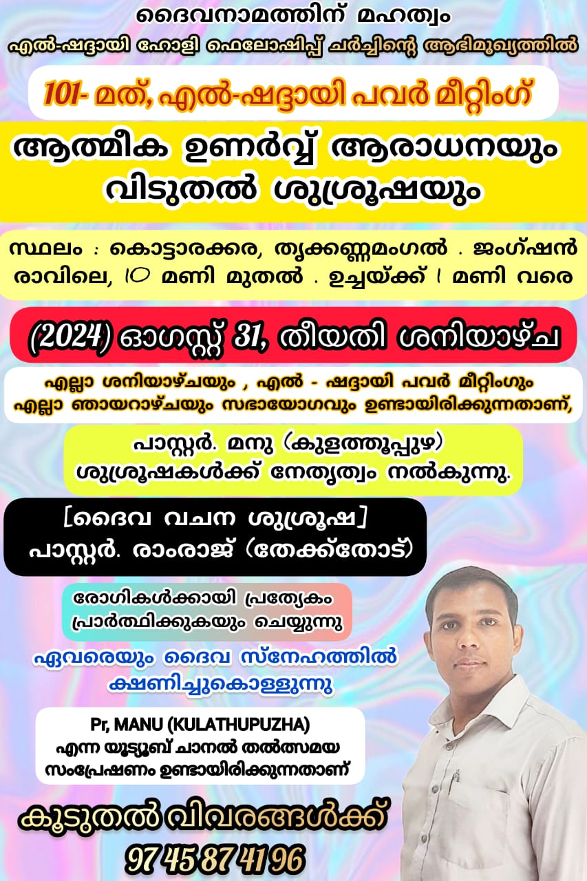 കൊട്ടാരക്കരയിൽ എൽ ഷദ്ദായി പവർ മീറ്റിംഗ് ChristianNews On Aug 29, 2024 53 കൊട്ടാരക്കര : എൽ ഷദ്ദായി ഹോളി ഫെലോഷിപ്പ് ചർച്ചിൻ്റെ ആഭിമുഖ്യത്തിൽ ആഗസ്റ്റ് 31 ന് തൃക്കണ്ണമംഗൽ ജംഗ്ഷനിൽ 101 മത് – എൽ-ഷദ്ദായി പവർ മീറ്റിംഗും ഉണർവ് യോഗവും നടക്കും. പാ. രാംരാജ് പ്രസംഗിക്കും, പാ. മനു നേതൃത്വം നൽകും. 53 Share