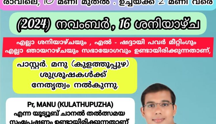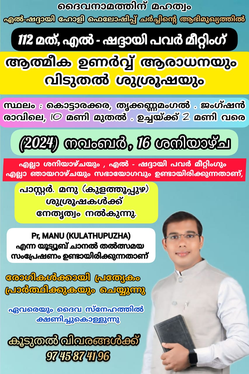 കൊട്ടാരക്കരയിൽ നാളെ എൽ ഷദ്ദായി പവർ മീറ്റിംഗ് ChristianNews On Nov 15, 2024 1,422 കൊട്ടാരക്കര : എൽ ഷദ്ദായി ഹോളി ഫെലോഷിപ്പ് ചർച്ചിൻ്റെ ആഭിമുഖ്യത്തിൽ നാളെ തൃക്കണ്ണമംഗൽ ജംഗ്ഷനിൽ 112 മത് – എൽ-ഷദ്ദായി പവർ മീറ്റിംഗും ഉണർവ് യോഗവും നടക്കും. പാ. മനു ശുശ്രുഷകൾക്ക് നേതൃത്വം നൽകും. 1,422 Share
