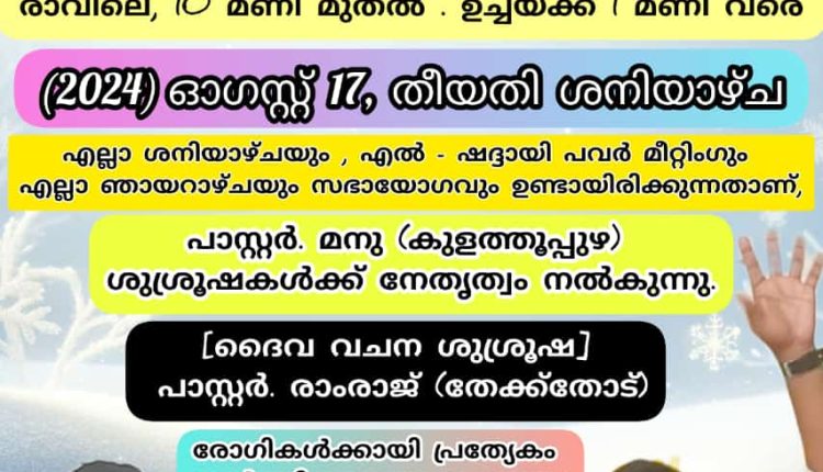 കൊട്ടാരക്കരയിൽ എൽ ഷദ്ദായി പവർ മീറ്റിംഗ് ChristianNews On Aug 14, 2024 68 കൊട്ടാരക്കര : എൽ ഷദ്ദായി ഹോളി ഫെലോഷിപ്പ് ചർച്ചിൻ്റെ ആഭിമുഖ്യത്തിൽ ആഗസ്റ്റ് 17 ശനിയാഴ്ച തൃക്കണ്ണമംഗൽ ജംഗ്ഷനിൽ 99 മത് – എൽ-ഷദ്ദായി പവർ മീറ്റിംഗും ഉണർവ് യോഗവും നടക്കും. പാ. രാംരാജ് പ്രസംഗിക്കും, പാ. മനു നേതൃത്വം നൽകും. 68 Share