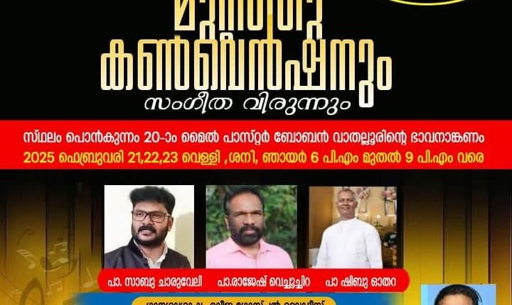 പൊൻകുന്നം : എലീജ ഗോസ്പൽ മിഷന്റെ ആഭിമുഖ്യത്തിൽ ഫെബ്രുവരി 21 മുതൽ 23 വരെ പൊൻകുന്നം 20-ാം മൈൽ പാസ്റ്റർ ബോബൻ വാതല്ലൂരിൻ്റെ ഭാവനാങ്കണത്തിൽ മുറ്റത്തു കൺവെൻഷനും സംഗീത വിരുന്നും നടക്കും. പാ. സാബു ചാരുവേലി, പാ. രാജേഷ് വെച്ചൂച്ചിറ, പാ. ഷിബു ഓതറ എന്നിവർ പ്രസംഗിക്കും. എലീജ ഗോസ്പൽ മെലഡീസ് ഗാനശുശ്രൂഷ നിർവഹിക്കും. പാ. അജി പുത്തൂർ ഗാനങ്ങൾ ആലപിക്കും.