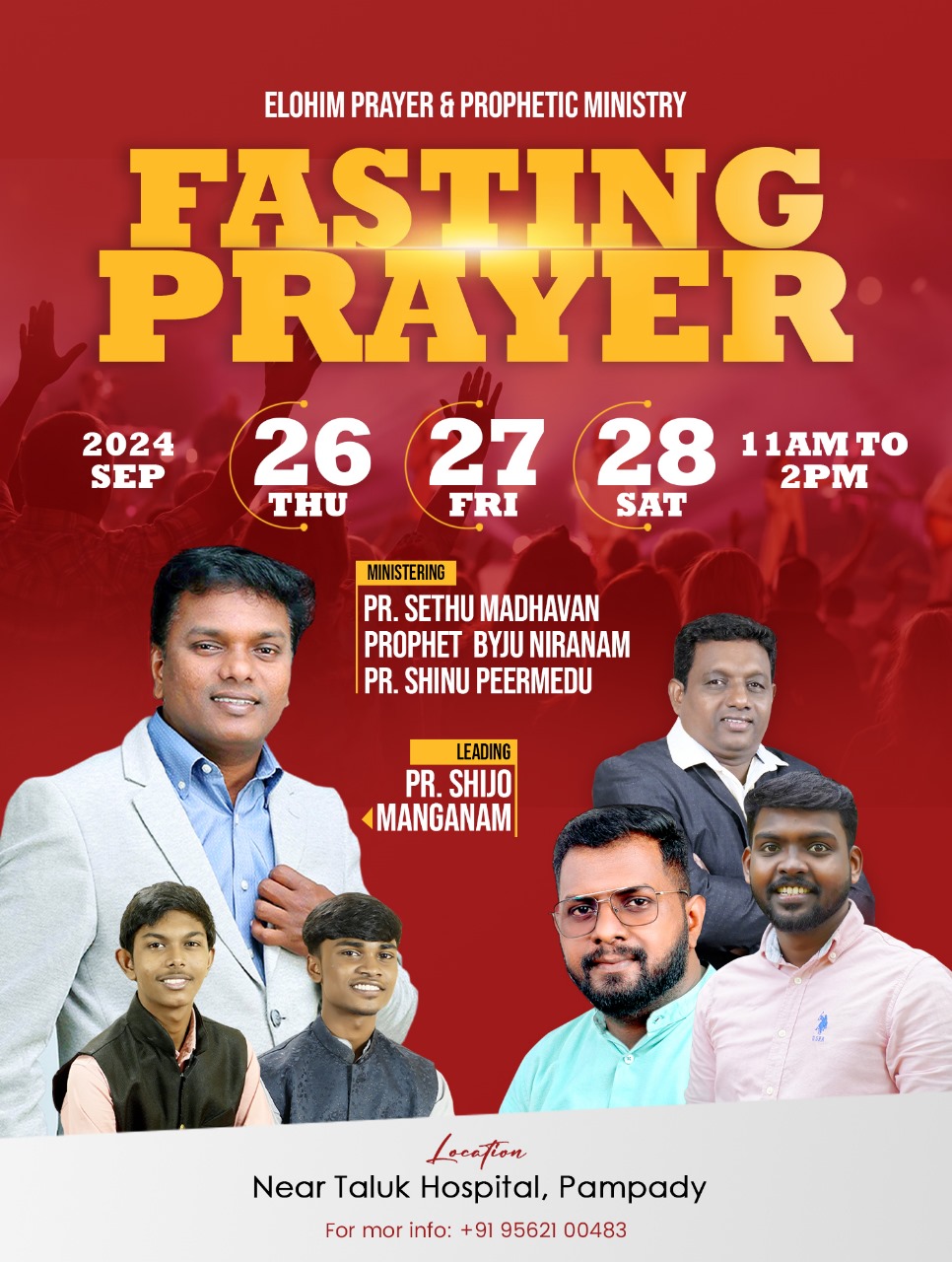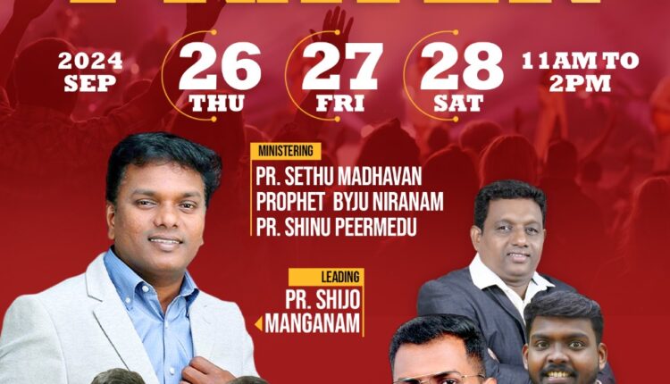 പാമ്പാടി : എലോഹിം പ്രയർ ആൻഡ് പ്രൊഫറ്റിക് മിനിസ്ട്രിയുടെ ആഭിമുഖ്യത്തിൽ സെപ്പ്റ്റംബർ 26 മുതൽ 28 വരെ പാമ്പാടി താലൂക് ആശുപത്രിക്ക് സമീപം 3 ദിവസത്തെ ഉപവാസ പ്രാർത്ഥന നടക്കും. പാ. സേതു മാധവൻ, പാ. ബൈജു നിരണം, പാ. ഷിനു പീരുമേട് എന്നിവർ പ്രസംഗിക്കും. പാ. ഷിജോ മാങ്ങാനം നേതൃത്വം നൽകും.