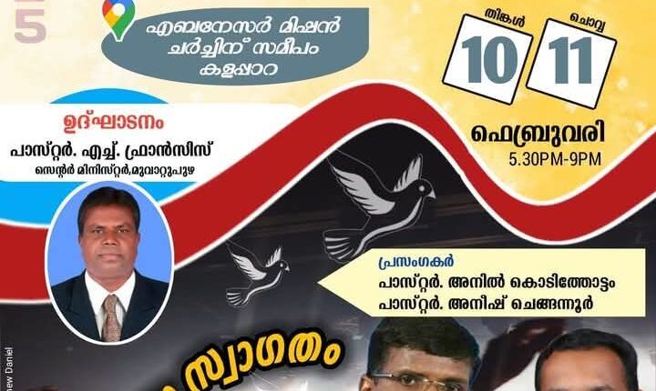 പാ. എച്ച് ഫ്രാൻസിസ് ഉദ്ഘാടനം നിർവഹിക്കും. പാ. അനിൽ കൊടിത്തോട്ടം, പാ. അനീഷ് ചെങ്ങന്നൂർ എന്നിവർ പ്രസംഗിക്കും. ഈറ്റാപ്പിളളി എബനേസർ മിഷൻ ചർച്ച് നേതൃത്വം നൽകും