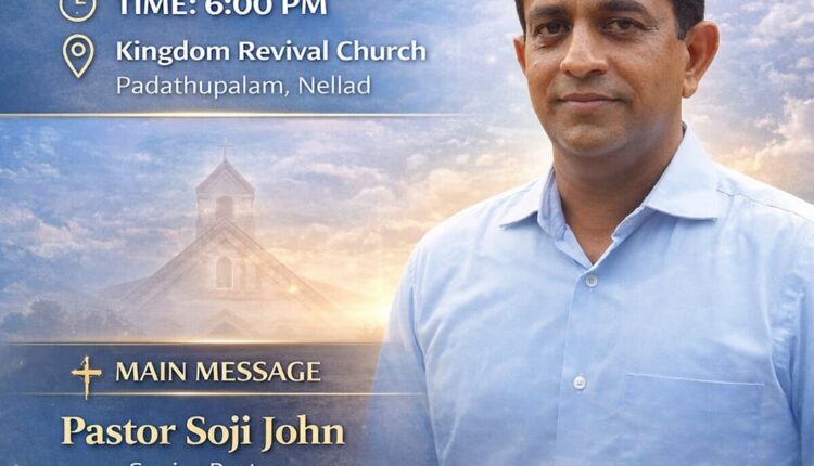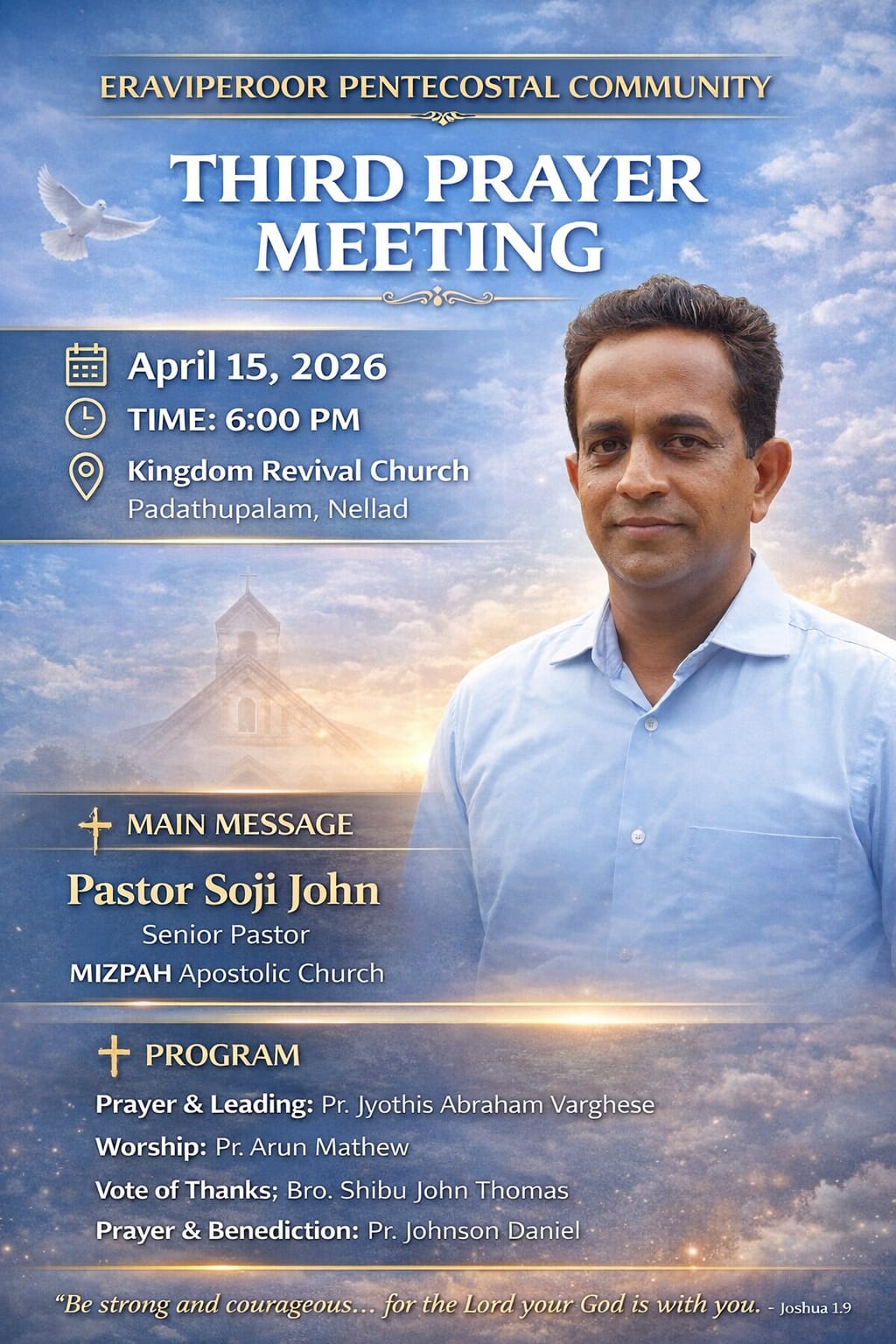 നെല്ലാട്: ഇരവിപേരൂർ പെന്തക്കോസ്ത് കമ്മ്യൂണിറ്റിയുടെ ആഭിമുഖ്യത്തിൽ സംഘടിപ്പിക്കുന്ന മൂന്നാമത് പ്രാർത്ഥനാ സമ്മേളനം ഏപ്രിൽ 15 ബുധനാഴ്ച നടക്കും. നെല്ലാട് പാടത്തുപാലത്തുള്ള കിംഗ്ഡം റിവൈവൽ ചർച്ചിൽ വൈകുന്നേരം 6 മണിക്ക് പ്രാർത്ഥനാ യോഗം ആരംഭിക്കും.