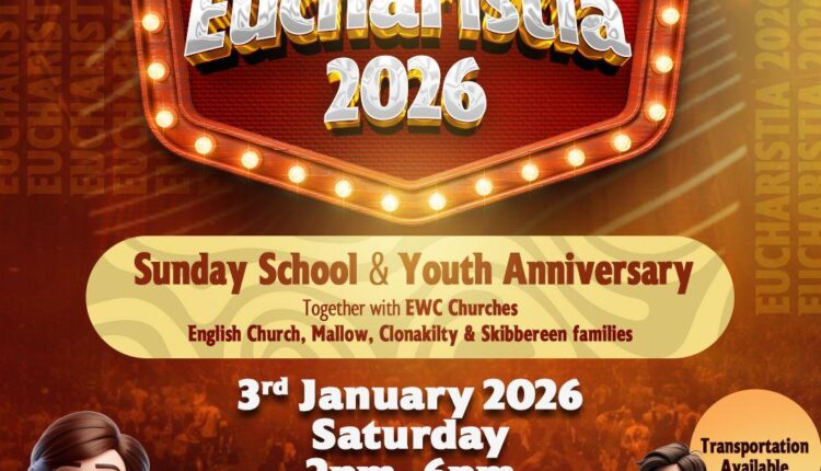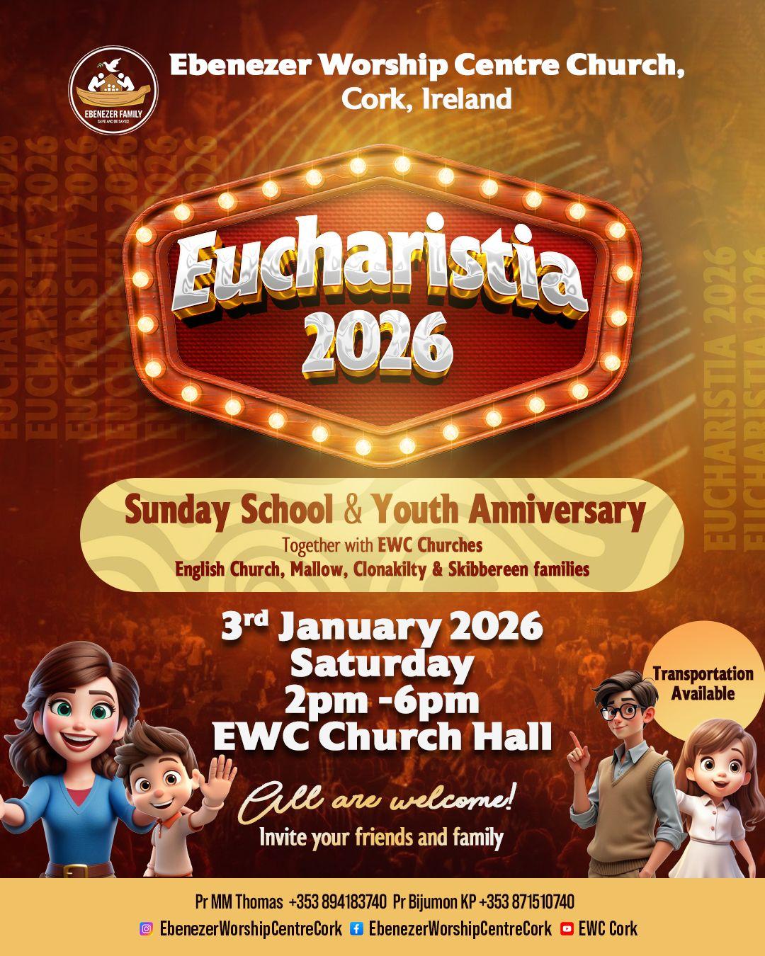 യൂക്കരിസ്റ്റിയ’: കോർക്ക്, അയർലൻറ് എബനേസർ വർഷിപ്പ് സെന്റർ സൺഡേ സ്കൂൾ – യൂത്ത് ആനിവേഴ്സറി ജനുവരി 3-ന്.