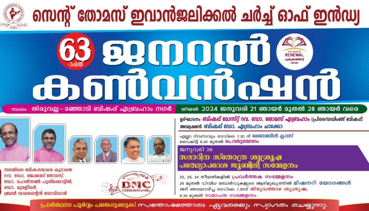തിരുവല്ല: സെന്റ് തോമസ് ഇവാൻജലിക്കൽ ചർച്ച് ഓഫ് ഇൻഡ്യ 63-ാമത് ജനറൽ കൺവൻഷൻ തിരുവല്ല മഞ്ഞാടി സഭാ ആസ്ഥാനത്തുള്ള ബിഷപ്പ് ഏബ്രഹാം നഗറിൽ നാളെ ആരംഭിക്കും. വൈകിട്ട് 6.30-ന് പ്രിസൈഡിംങ് ബിഷപ്പ് ഡോ. തോമസ് ഏബ്രഹാം ഉദ്ഘാടനം ചെയ്യും. ബിഷപ്പ് ഡോ. എബ്രഹാം ചാക്കോ അദ്ധ്യക്ഷത വഹിക്കും. സഭയിലെ ബിഷപ്പന്മാരെ കൂടാതെ റവ. ഡോ. ജേക്കബ് തോമസ്, ഡോ. പോൾസൺ പുലിക്കോട്ടിൽ, ഡോ. മുരളീധർ, വാലന്റൈൻ ഡേവിഡാർ എന്നിവർ മുഖ്യ പ്രസംഗകർ ആയിരിക്കും. 22 തിങ്കൾ മുതൽ 24 ബുധൻ വരെ സഭയിലെ വൈദികർ,സുവിശേഷകർ, സേവിനിമാർ എന്നിവർക്കായുള്ള സമ്മേളനങ്ങൾ നടക്കും.