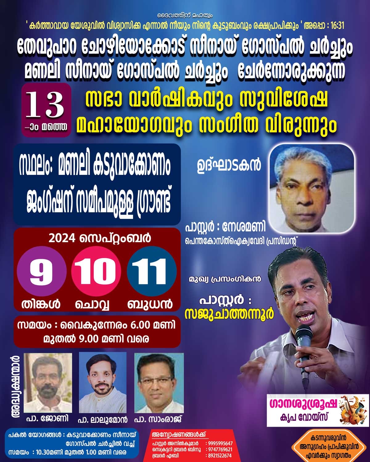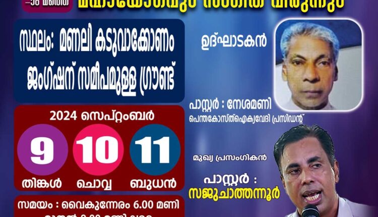 സെപ്റ്റംബർ 9 മുതൽ 11 വരെ മണലി കടുവക്കോണം ജംഗ്ഷന് സമീപമുള്ള ഗ്രൗണ്ടിൽ സഭാ വാർഷികവും സുവിശേഷ മഹായോഗവും സംഗീത വിരുന്നും നടക്കും.
