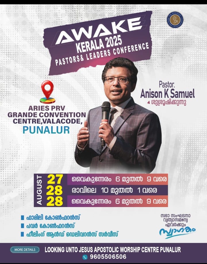 പുനലൂർ: റ്റാമി കേരളയുടെ നേതൃത്വത്തിൽ എവെക്ക് 2025 എന്ന പേരിൽ പാസ്റ്റേഴ്സ് ആൻഡ് ലീഡേഴ്സ് കോൺഫറൻസ് ഓഗസ്റ്റ് 27, 28 തീയതികളിൽ പുനലൂർ വാളക്കോട് ഏരിസ് പി ആർ വി ഗ്രാൻഡെ കൺവൻഷൻ സെന്ററിൽ നടക്കും.