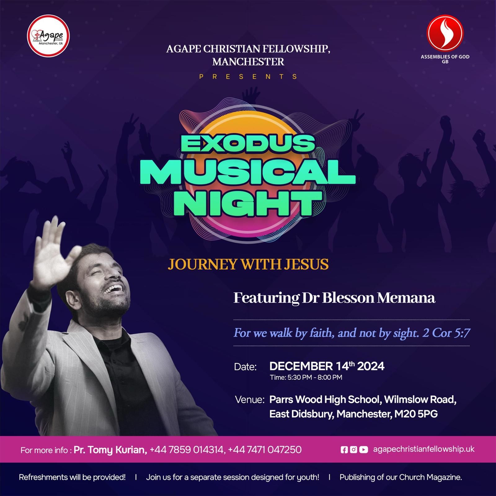 മാഞ്ചസ്റ്റർ: അഗപ്പേ ക്രിസ്ത്യൻ ഫെല്ലോഷിപ്പ് മാഞ്ചസ്റ്റർ സംഘടിപ്പിക്കുന്ന എക്സഡസ് മ്യൂസിക്കൽ നൈറ്റ് ഡിസംബർ 14 വൈകുന്നേരം 5:30 മുതൽ 8:00 വരെ പാസ്വുഡ് ഹൈസ്കൂൾ ഓഡിറ്റോറിയത്തിൽ (Postcode: M20 5PG) നടക്കും.
