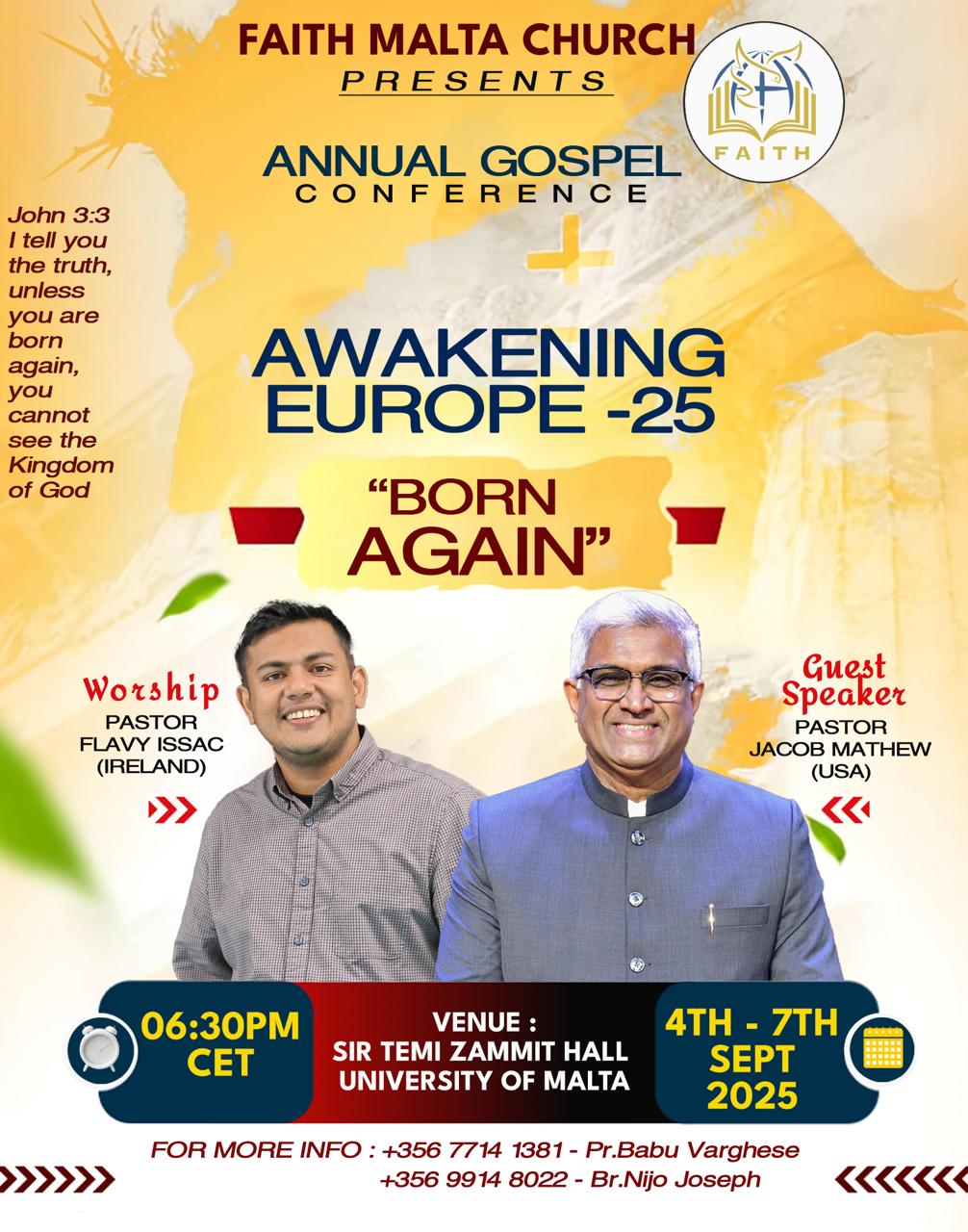മാൾട്ട : മാൾട്ടയിലെ പ്രഥമ പെന്തക്കോസ്ത് കൂട്ടായ്മയായ ഫെയ്ത്ത് മാൾട്ടയുടെ മൂന്നാമത് വാർഷിക കൺവെൻഷനും സംഗീതവിരുന്നും സെപ്റ്റംബർ 4 മുതൽ 7 വരെ മാൾട്ട യൂണിവേഴ്സിറ്റി കോൺഫറൻസ് ഹാൾ ,എംസിദയിൽ വൈകിട്ട് 6.30 മുതൽ നടക്കും.