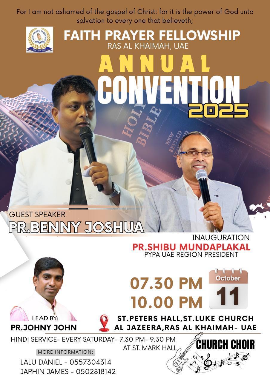 യുഎഇ : റാസ് അൽ ഖൈമ ഫെയ്ത് പ്രയർ ഫെല്ലോഷിപ്പ് സഭയുടെ ആഭിമുഖ്യത്തിൽ ശനിയാഴ്ച അൽ ജസീറ സെന്റ് ലൂക്ക് ചർച്ച് സെന്റ് പീറ്റേഴ്സ് ഹാളിൽ ആനുവൽ കൺവെൻഷൻ നടക്കും. പാ. ഷിബു മുണ്ടപ്ലാക്കൽ ഉദ്ഘാടനം നിർവഹിക്കും. പാ. ബെന്നി ജോഷുവ പ്രസംഗിക്കും. ചർച്ച് കൊയർ ഗാന ശുശ്രുഷ നിർവഹിക്കും.